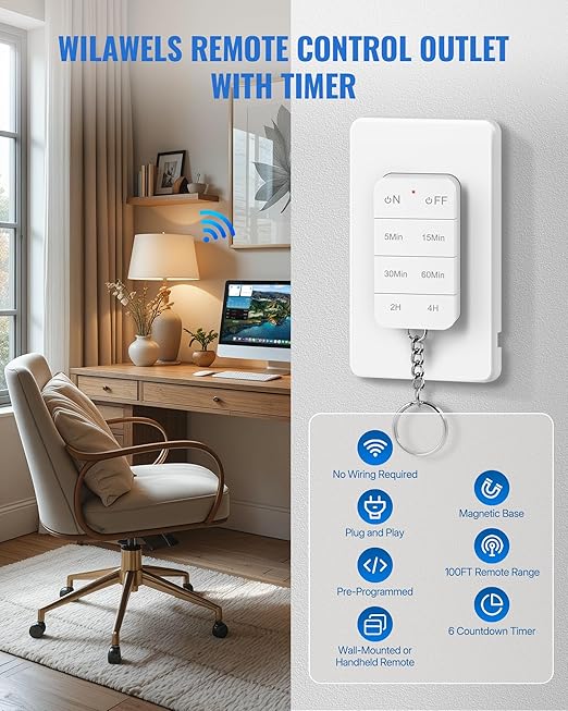 - Set A Timer: Add a timer to turn off lights and devices after 5 min, 15 min, 30 min, 60 min, 2 hours, or 4 hours, saving energy and time. Have lights there that just turn off automatically. WILAWELS indoor outlet timer with remote offers a caring choice for the elderly, pregnant women, or those with limited mobility