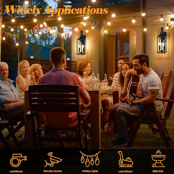 - 【Weather Resistant & Application】The black dusk to dawn outdoor lighting features a sturdy metal frame, rust-resistant coating, and thickened clear glass to ensure long-lasting durability without rusting, corroding, or fading. It withstands all weather conditions—rain, snow, ice, or heat, maintaining its sleek and stylish appearance.The built-in GFCI outlet offers outdoor power supply for holiday lights, leaf blower, lawn mower, BBQ grill, porch fan. Ideal outdoor light for front door, patio, porch, garage, balcony, entryway, etc