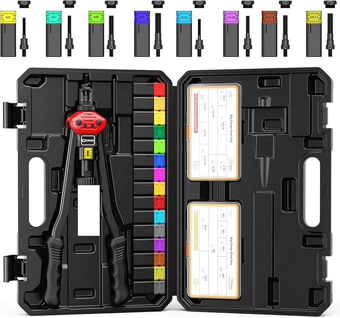 16" Rivet Nut Gun with Stroke Adjustment - 15 Metric and SAE Mandrels (M3-M12 & to 1/2") + 8 Extra Long - 200 Threaded Nuts (100 Each) in Storage Boxes - Portable Blow Molded Case