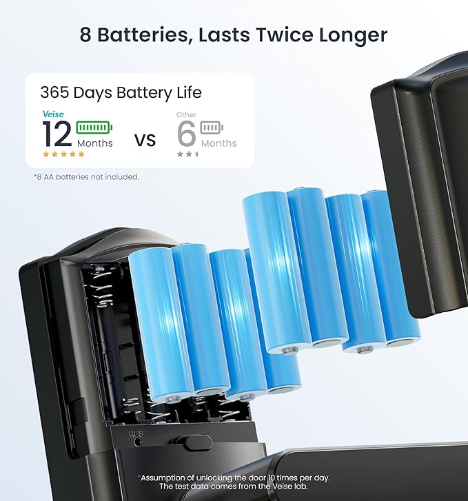 - 12-Month Battery Life: Powered by 8 AA batteries (not included) that last a full year, eliminating frequent changes. Type-C emergency charging + backup key - double protection against lockouts