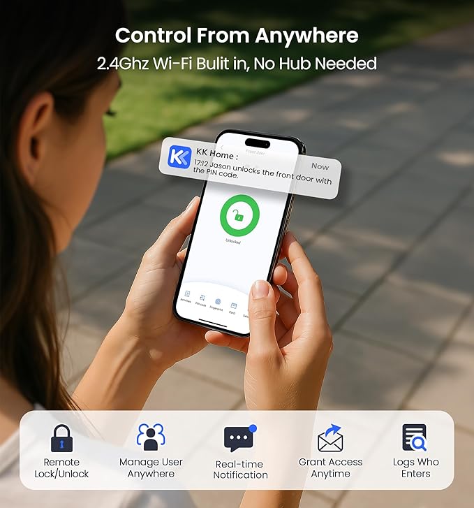 - Built-in WiFi for Remote Access:Control your lock from anywhere via 2.4GHz WiFi - no hub needed. Get instant alerts and real-time updates. Check access logs anytime on your phone