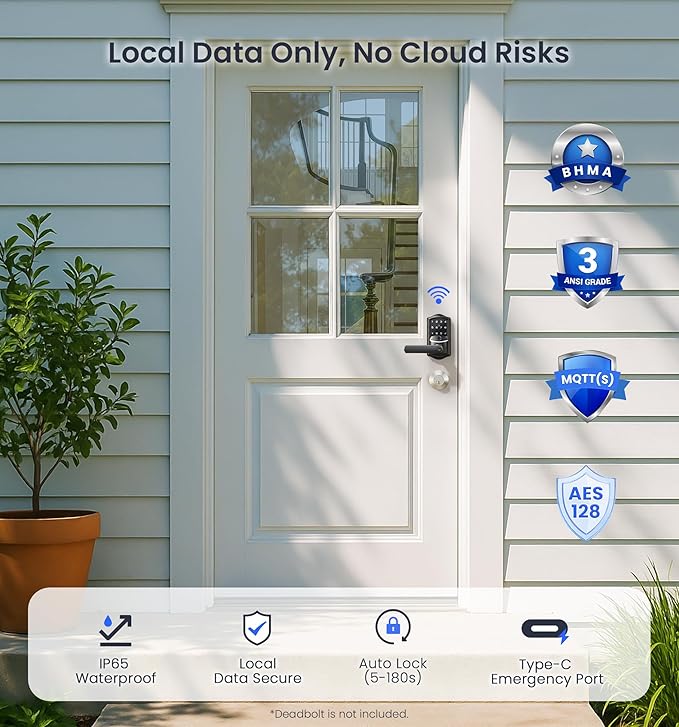 - All-Weather Smart Security: With waterproof IP65 rating and extreme temp resistance (-35°F~160°F), your lock delivers reliable protection. AES-128 encryption keeps data local and secure, while automatic locking provides 24/7 protection