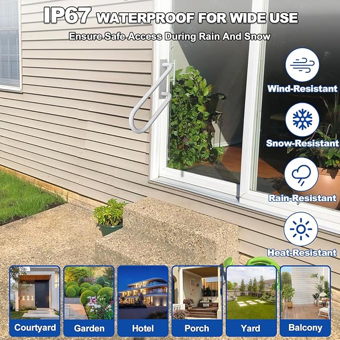 - IP67 WATERPROOF HANDRAIL FOR 1–2 STEPS–This porch handrail offers a 55 cm (19.69") grip length. This outside handrail for stairs is designed for side installation. The handrails for outdoor steps provide sturdy support for safe step access, helping prevent slips and falls in rain or snow.