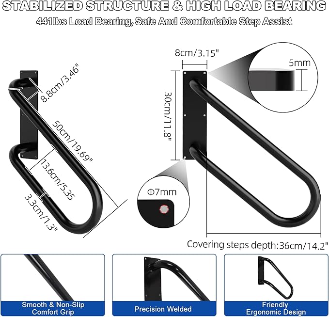 - ANTI-CORROSION & DURABLE–The outdoor stair hand rail is made of black powder-coated carbon steel. This wall-mounted outdoor handrail resists scratches, rust, UV, and weather damage. The 2 mm (0.08") thick anti-fracture steel pipe, reinforced welds, and galvanized heavy-duty screws support up to 441 lbs.