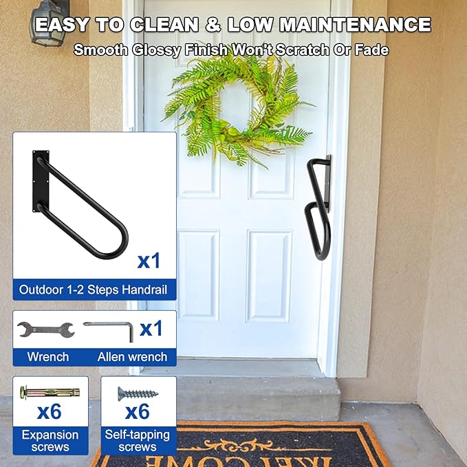 - EASY TO INSTALL & MAINTAIN–Door jamb side mount mount single step handrail to wood with 6 self-tapping screws or to concrete with 6 expansion screws (all included). Simply mark the spot, drill holes, and secure the rail. Smooth, non-slip, scratch-resistant, and easy to clean. Just wipe with a cloth to remove dust.