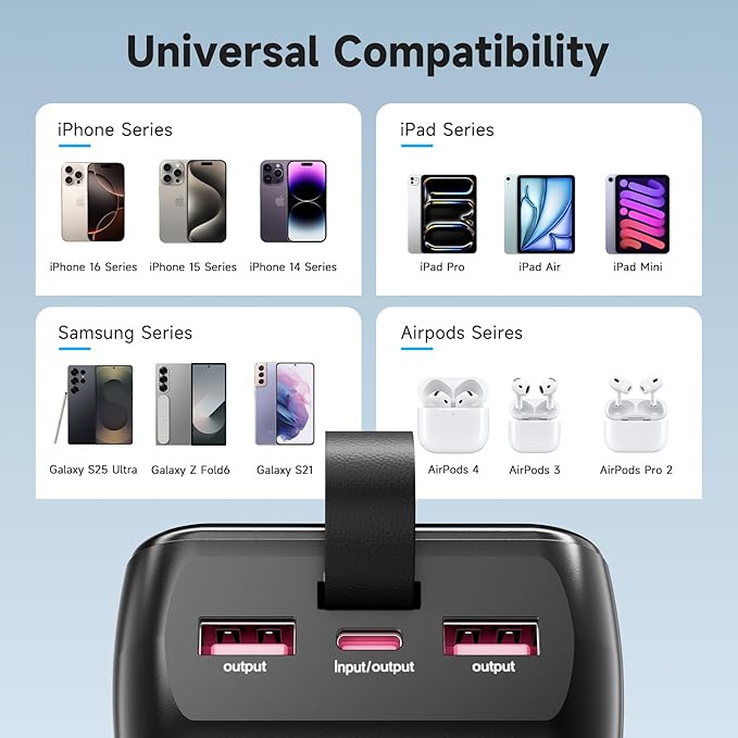 - Safe & Reliable Battery Bank:Built with advanced safety technology, this portable phone charger provides multi-protection against overcharge, overvoltage, overcurrent, short circuits, and overheating. The premium BMS chip ensures your devices charge safely at high speeds - making it the most reliable portable charger for your valuable electronics.