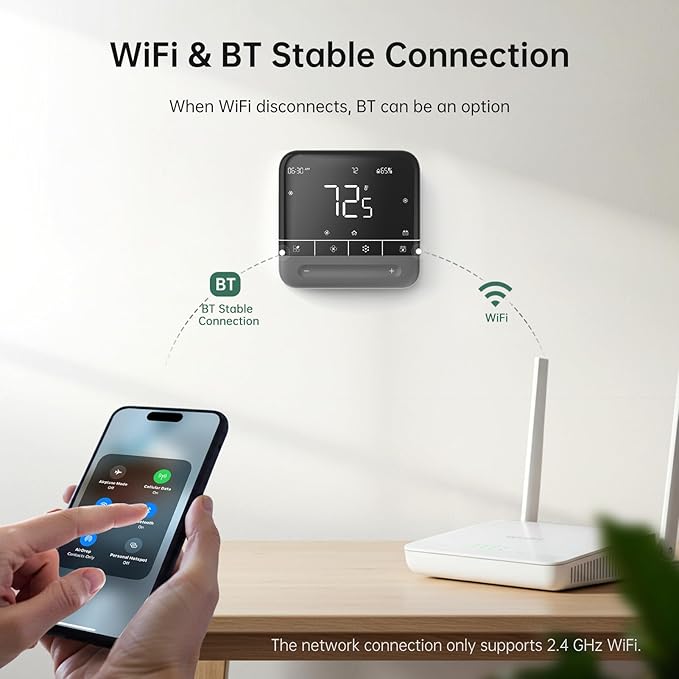 - WiFi and BT Mesh Tech: The thermostats for home supports 2.4GHz WiFi only with BT Mesh mode,and WiFi thermostat automatically switches to local control during network disruptions, ensuring stable connectivity for seamless temperature monitoring and adjustment