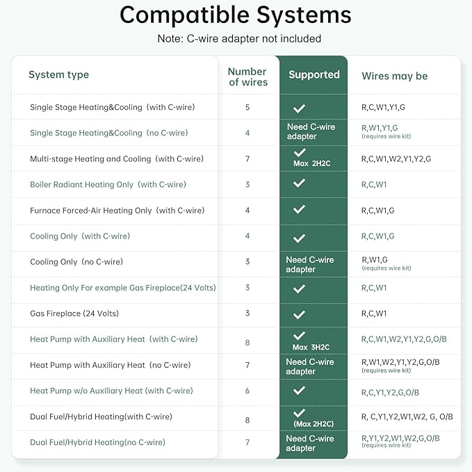 - Wide HVAC Compatibility: Supports 3H2C. The smart thermostat is compatible with over 95% of 24VAC HVAC systems, including central air conditioning, heat pumps, boilers, furnaces. The self-test compatibility guide ensures quick setup and easy installation
