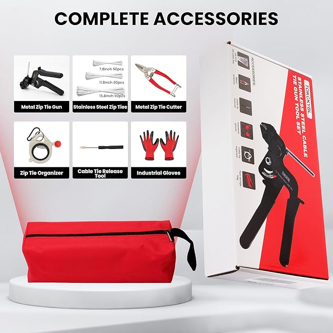 - Complete Professional Kit: Includes ①Stainless Steel Cable Tie Gun, ②150PCS Self-Locking 304 Stainless Steel Zip Ties (3 Sizes: 8", 12", 16") ③Metal Zip Tie Cutter ④Tie Remover ⑤Gloves ⑥Storage Bag ⑦Zip tie holder
