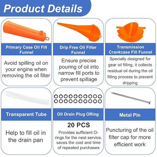 Oil Change Tool Kit for Harley Davidson Accessories,Oil Filter Wrench,Crankcase Fill Tool,Primary Case Funnel,Drip-Free Oil Filter Funnel,20PCS O-Rings