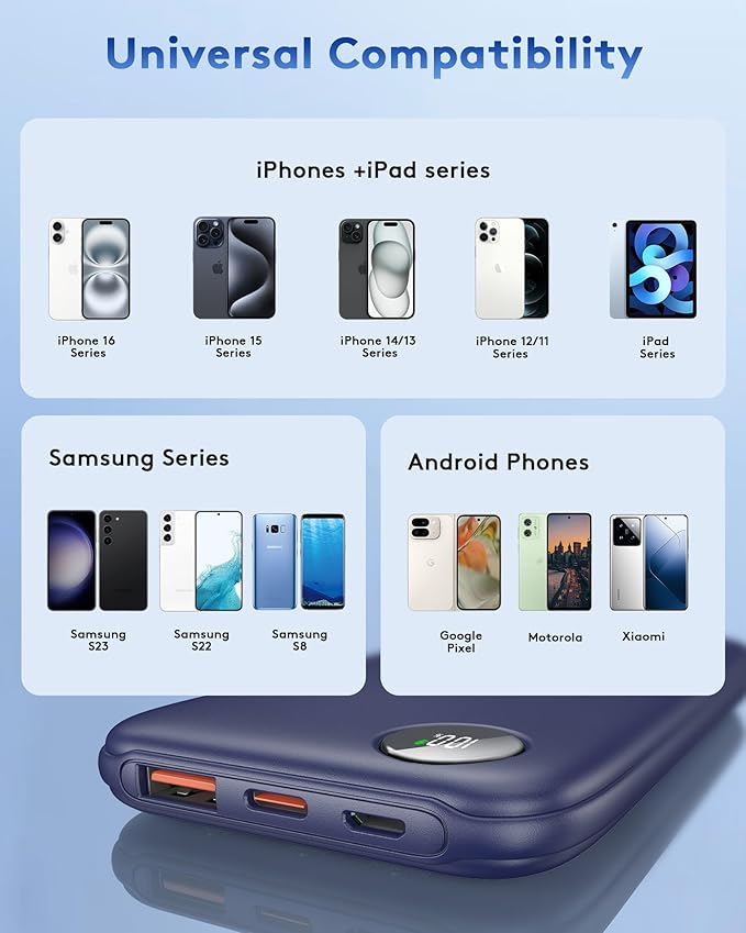 - ๐ More Comprehensive Phone Battery Bank: Compatible with all smartphones, including the entire series of iPhone 16/15/14/13/12/11/X/8, Samsung, Google, Android, and more. It can charge the iPhone 16 twice, iPhone 12 2.3 times. It's sufficient to meet your daily needs.๏ผThis product only includes one Type-C charging cable and does not come with a Lightning charging cable.)