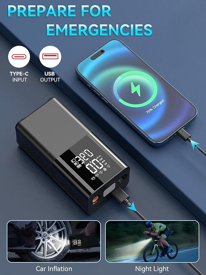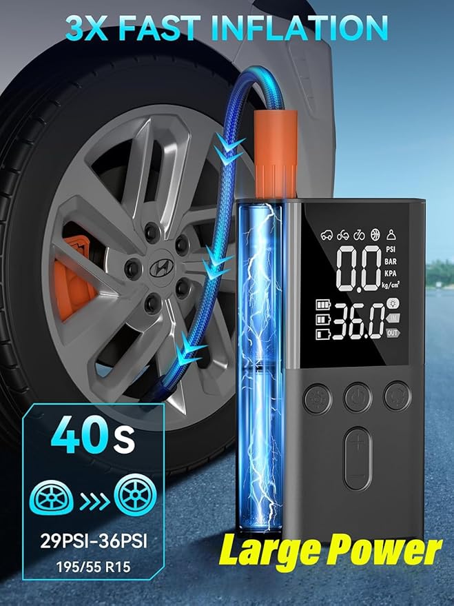 - 🚗【Large-Capacity battery】The portable tire inflator for car has a built-in high-capacity battery, which can inflate multiple tires on a single charge. The old car tire air pump portable only supports 3 tires, while the upgraded air compressor for car can fill 15 tires to meet your long-distance travel needs. The car air pump may automatically shut down before inflation is completed. Don't worry, this is temperature protection. You can continue to inflate after the temperature drops.