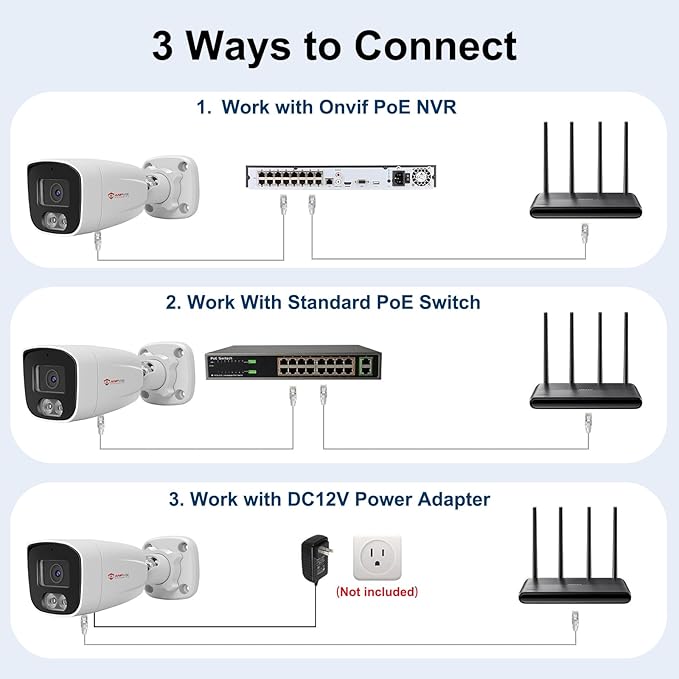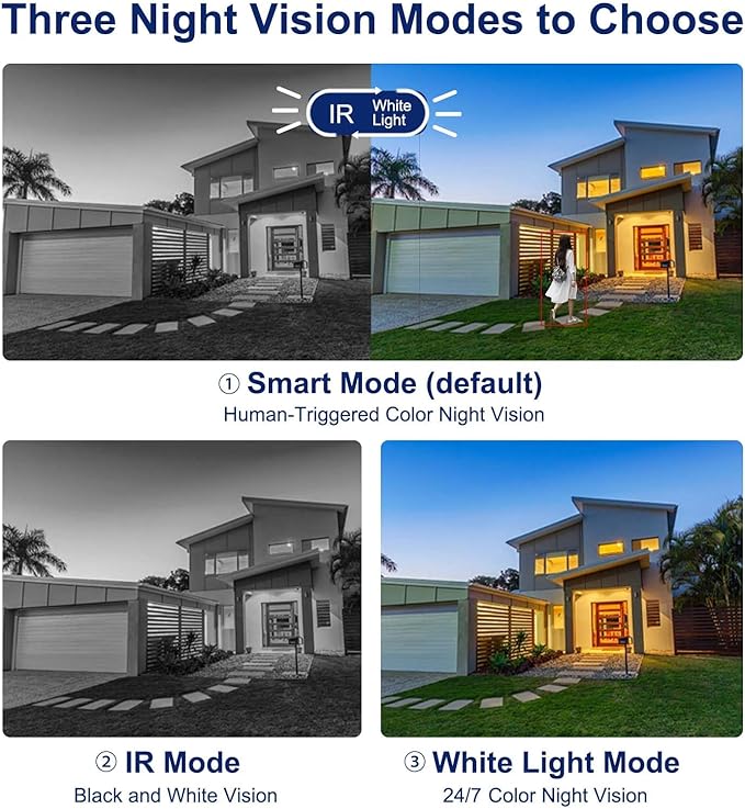 - 100ft Smart Color Night Vision with Spotlights: This 4MP ip poe security camera enables you to view clear images with brilliant color in live video streaming and playback. Once an intruder is detected, the camera’s spotlights will be triggered automatically to warn off the would-be criminal. You could also manually activate the spotlights to stop the crime before it happens. Three night vision modes to choose: smart color night vision, 24/7 color night vision, IR night vision.