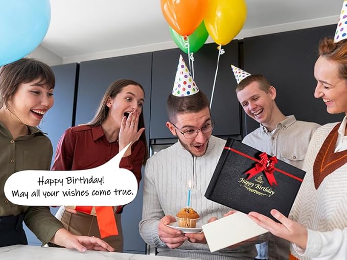 - Gift Set “HAPPY BIRTHDAY”: This elegant gift box printed 'HAPPY BIRTHDAY' on the lid, with a laser-engraved tag inside reading 'HAPPY BRITHDAY' and 'MAY YOUR JOURNEY BE BRIGHT' The heartfelt messages make it a unique and perfect gift for any birthday man