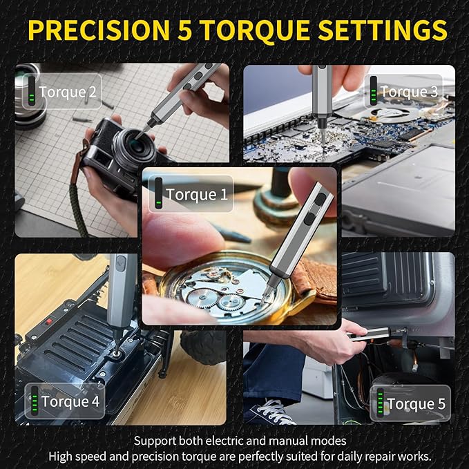 - 【Precision Torque,Quick Control】: The RESPLESS electric precision screwdriver with 5 torque settings,the electric torque can be adjusted from 0.12 to 0.35N.m,and manual torque up to 5N.m.This dedicate electric screwdriver kit offers accurate torque is perfectly suited for your daily precision repair work needs.Ideal for cameras,toys,electronics,instruments,mobile phones,Pc,etc