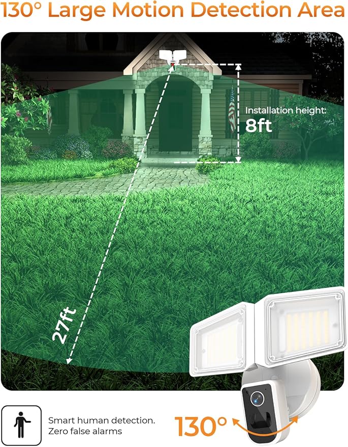 - 2K HD & Color Night Vision Floodlight Camera: See more with 2K ultra-clear resolution and full-color night vision. This floodlight camera outdoor captures sharp images even in low-light conditions—perfect for driveways, front doors, and backyards.
