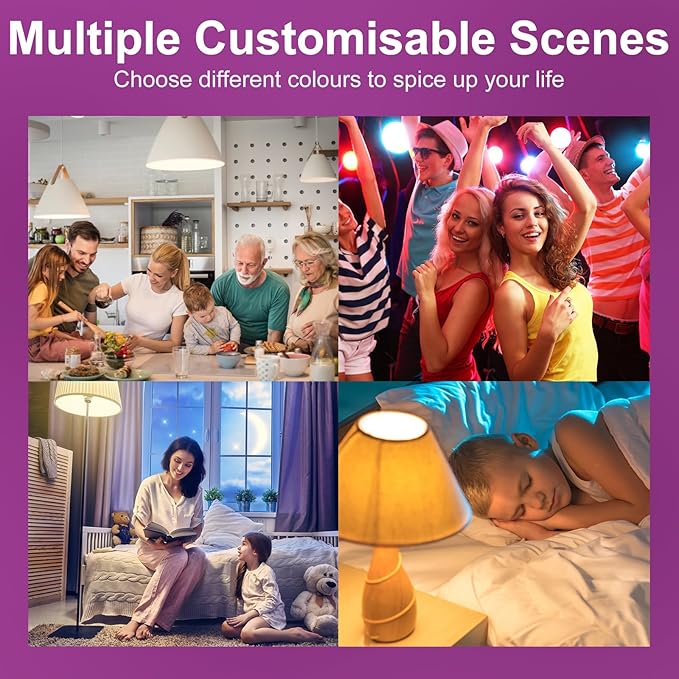- 【RGB + Cool Light + Warm White Light】The HYDONG WiFi Smart Bulb can switch between multiple colors, with a wide color gamut ensuring true-to-life color reproduction, offering you a richer visual experience. Simply connect the bulb to your Wi-Fi via the Tuya app on your smartphone. It offers 16 million colors and 25 scene modes to choose from, bringing your space to life. Note: The bulb does not support dimming via wall switches; dimming is only available through the Tuya app.