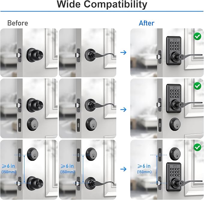 - Easy Installation: Includes all necessary hardware, adjustable latch to fit 2-3/8" or 2-3/4" backset. Effortlessly install this versatile keyless entry door lock with handle on any left or right-handed door. You can replace your existing door lock in about 15 minutes with just a screwdriver for just men and women. Suitable for 2-1/8" (54mm) door holes, no extra work on standard door prep.