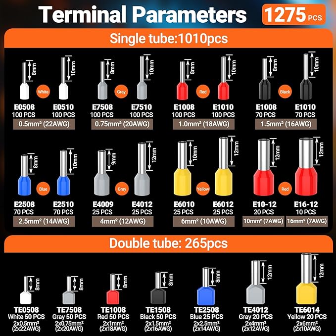 - 【Ferrule Crimping Tool Kit】 This ferrulekit totally includes 1275PCS Wire ferrules Connectors. 1010PCS for Single-line ferrules connectors and 265PCS for Twin-line ferrules connectors,and a double-layer portable storage box for easy carrying and organization