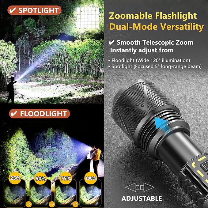 - ๐ใZOOMABLE ADJUSTABLE & 6 LIGHTING MODESใ Compared to the traditional Flashlights with only 5 modes (high/medium/low/sos/strobe), our XHP360 powerful Flashlights with lumens have a new super bright mode to meet the brightest lighting needs. In addition, we have set up a separate function key to the Super Bright Flashlight to make the sos and double flash functions more convenient to use.