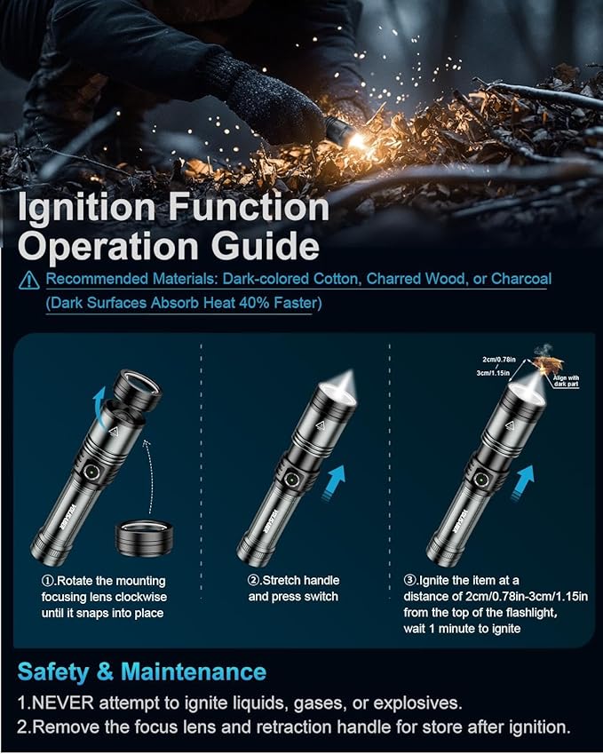 - 【Survival Flashlight with Patented Fire-Starting Lens】 Our U.S. Patented Ignition Lens utilizes a powerful high power LED wick that is focused through the ignition lens to create a 1200°F ignition point, igniting combustibles in a short period of time. A must-have camping flashlight for emergencies, off-grid adventures, or wildfire prep. Exclusive feature – no competitor flashlights offer this fire-starting capability