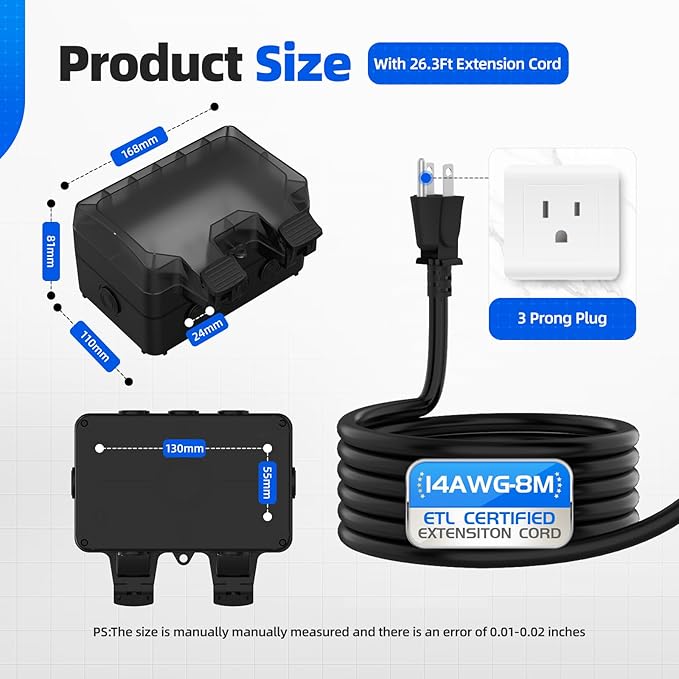 - Extension Cord Design:The outdoor outlet box is equipped with ETL certified 14AWG 26.3ft extension cord waterproof, no need to rewire, flexible to meet the outdoor power needs in multiple scenarios