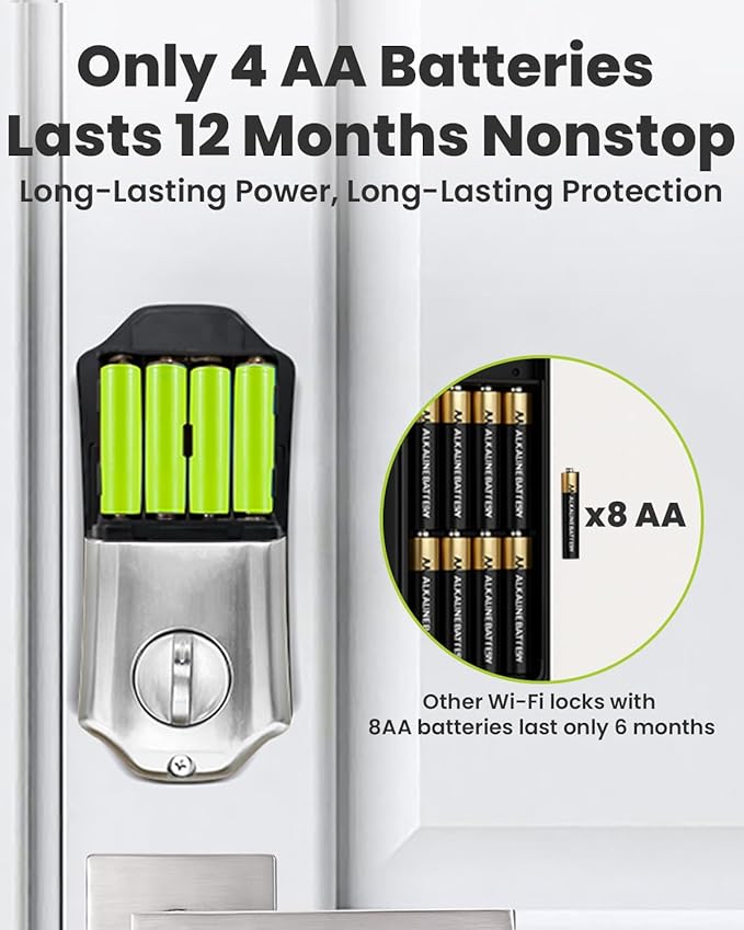 - BUILT FOR DURABILITY AND SECURITY: Featuring solid construction that meets ANSI security standards, this smart lock is tested for over 100,000 lock/unlock cycles and boasts IP56 dustproof and waterproof ratings. It's weather-resistant for extreme conditions. With advanced security features like auto-lock, one-touch locking, virtual code, temporary password and low battery alert, your home is fortified against unauthorized access