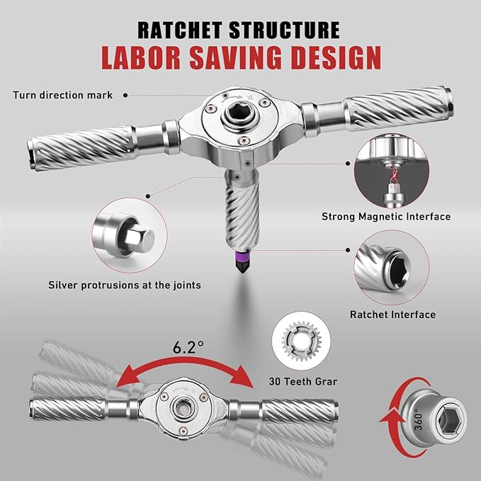 - 80% Effort Saving – The ratcheting design reduces effort by 80% compared to regular screwdrivers and stays comfortable even during extended use. Easily switch between clockwise and counterclockwise to tighten or loosen screws without turning your wrist