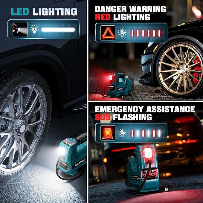 - Fast Inflation: Powered by 25mm metal cylinder and brushless motor, this portable air compressor delivers lightning-fast inflation at 40L/min—filling a standard 195/65/R15 tire in under 3.3 minutes. The built-in 3-mode LED flashlight (SOS, hazard warning, steady light) ensures safe, reliable visibility for nighttime emergencies or low-light repairs.