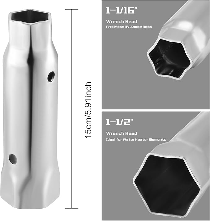 - Dual-Head Wrench for Maximum Compatibility – One socket fits 1 1/16", the other fits 1 1/2" hex heads. Designed to handle a variety of anode rods and heating elements commonly used in RV hot water systems.