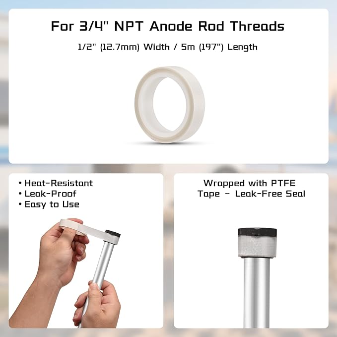 - Leak-Proof PTFE Tape – Includes a full 5m (197") roll of 1/2" wide white Teflon tape for secure NPT thread sealing. Heat resistant and durable for hot water applications.