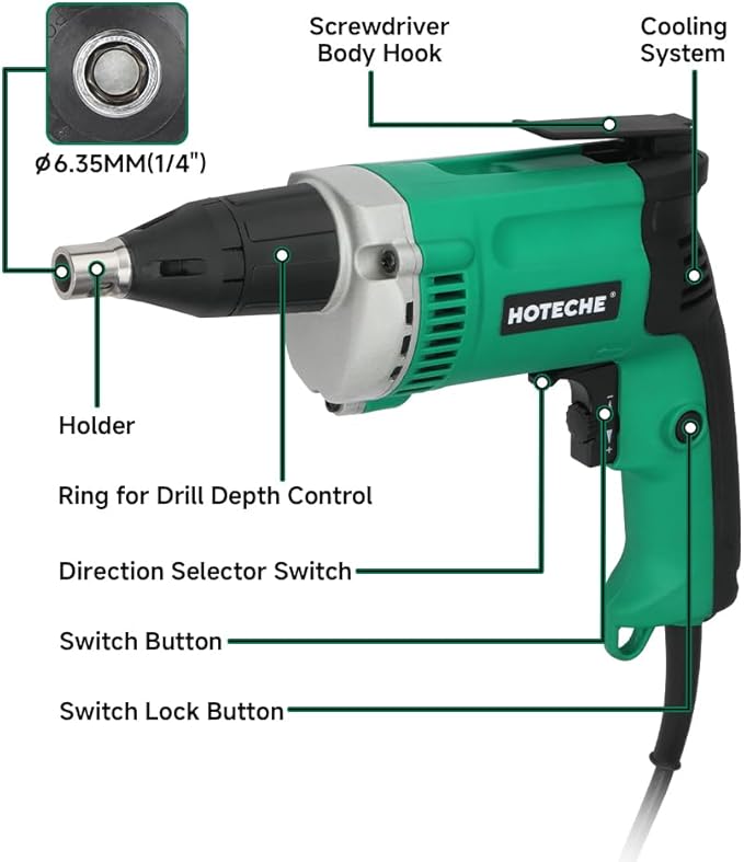 Hoteche 5-Amp Dry Wall Screw Driver, Electric Screwdriver with Variable Speed 0-4500 RPM, 1/4" Chuck, Forward & Reverse Switch with 6pcs Cr-V Bits