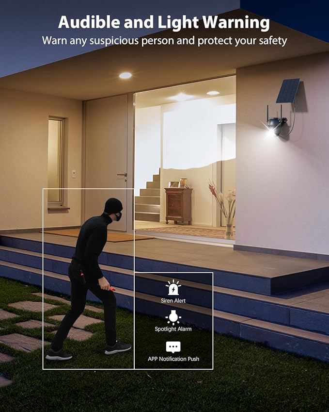 - 【Solar-Powered & Easy Installation】This Solar WiFi Camera operates entirely on solar energy, featuring a built-in 5200mAh rechargeable battery. No electrical wiring or outlets are required, enabling flexible installation anywhere. 3.5W angle-adjustable solar panel maximizes sunlight exposure from all directions, ensuring uninterrupted operatio. Zero wiring – Simple, plug-free setup eliminates installation costs. All-weather reliability – IP66 Weatherproof design guarantees year-round security.