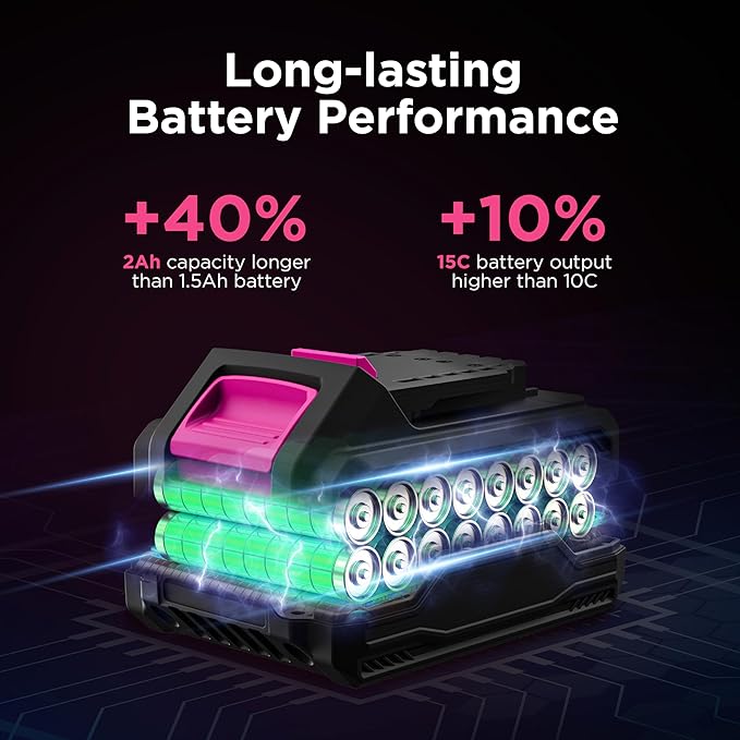 - 【EXTENDED RUNNING TIME WITH 2.0Ah BATTERY】This cordless drill has 33% more running time than a 1.5Ah battery, allowing you to drill through 800 screws on a full charge or 100 times through a 19/16-inch-thick board.