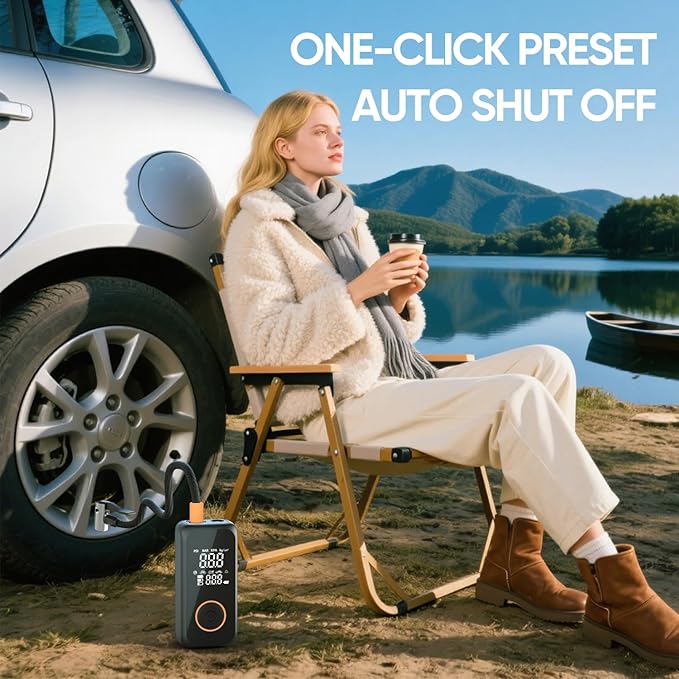 - 【Smart Inflation & Precise Auto Shutoff】Features a sensitive pressure sensor and advanced chip. Choose from 5 preset modes (bicycle, motorcycle, car, ball, custom). The LCD clearly shows accurate real-time and preset pressure during inflating, supporting 4 units (BAR, KPA, PSI, KG/CM²) with precision within ±1 PSI. Automatically shuts down at the target pressure to prevent over-inflation.