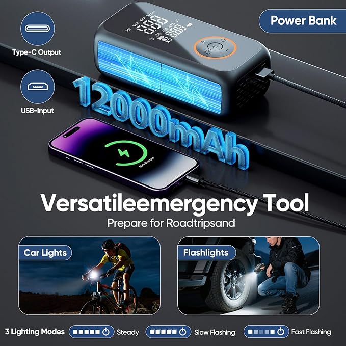 - 【Essential Multi-Function Emergency Tool】More than just a portable air compressor, it's your vital emergency companion. The bright LED light illuminates dark tire changes, nighttime inflation, or acts as a warning signal. The Type-C charging port and 5V/2A USB output port transform it into an emergency power sourcefor your devices.