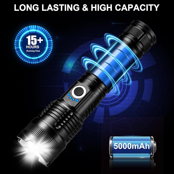 - 【5000ɱAh ΒATTERY & Power Display】LED flashlight has a built-in 5000ɱAh rechargeable ΒATTERY that can provide you with up to 15 hours of outdoor lighting time and can be recharged more than 1500+ times. 4 blue LED indicators show the charging status (25%, 50%, 75%, 100%)