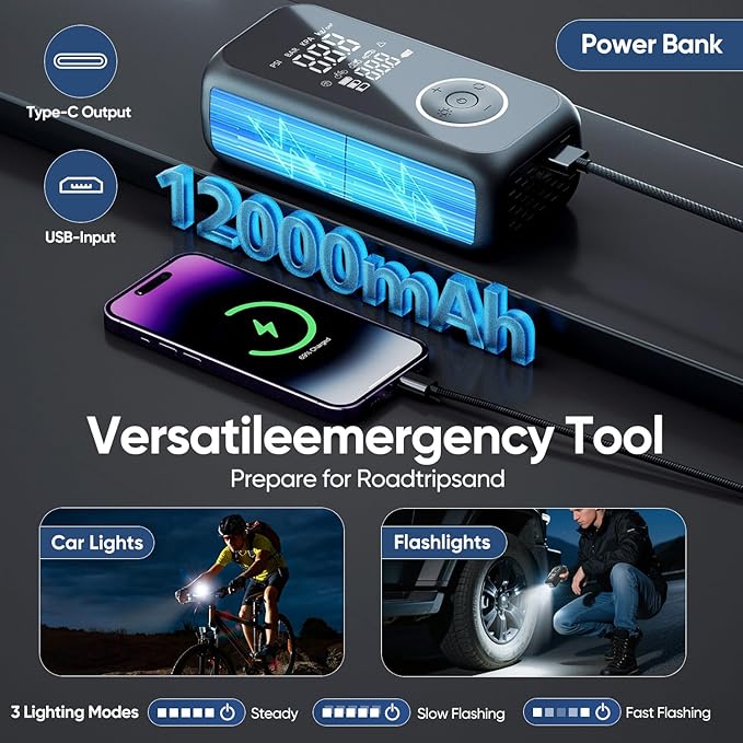 - 【Essential Multi-Function Emergency Tool】More than just a portable air compressor, it's your vital emergency companion. The bright LED light illuminates dark tire changes, nighttime inflation, or acts as a warning signal. The Type-C charging port and 5V/2A USB output port transform it into an emergency power sourcefor your devices.