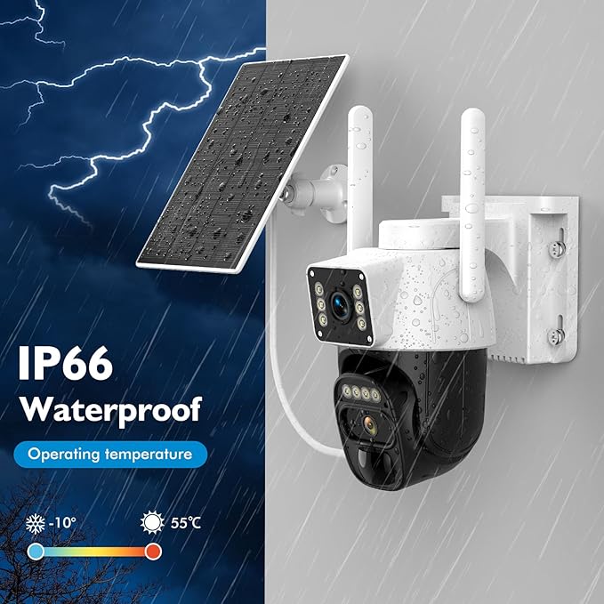 - 【 Dual Lens & PTZ 】Wireless outdoor security camera equipped with dual-lens system, 360-degree coverage, 2K ultra-high-definition lens, synchronized capture more vivid colors and fine details, all-round control of the security area dynamics. The upper fixed lens locks the key area, the lower rotating lens supports 355°horizontal + 90°vertical rotation (APP remote control).