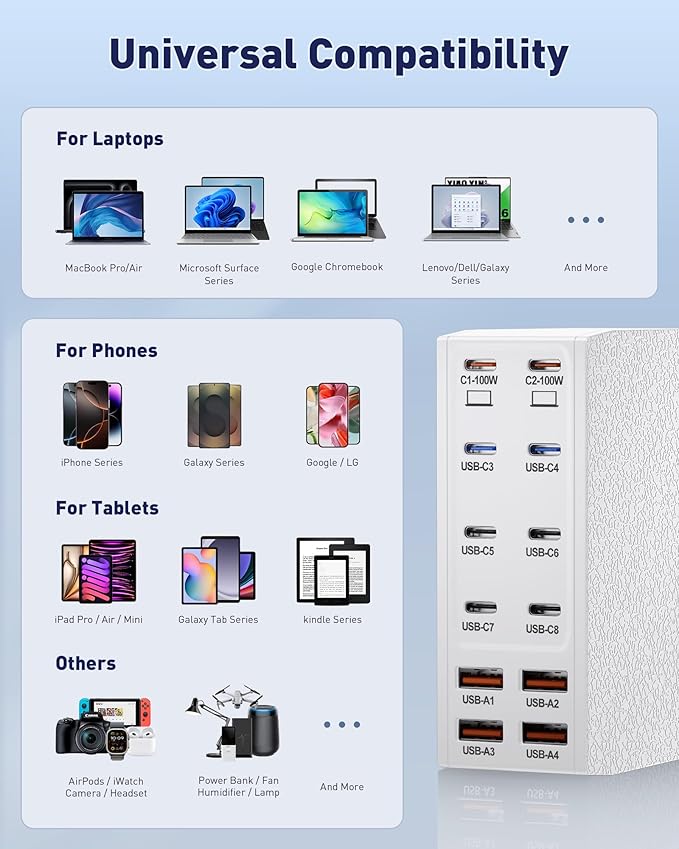 - 【Universal Compatibility】Our USB C charging station is equipped with 2*100W and 2*65W fast charging ports, which can charge 3 or more laptops at the same time. Compatible with smartphones, tablets and laptops, suitable for MacBook Pro/Air, Dell XPS, iPad Pro, iWatch, AirPods, Surface Pro, Galaxy S24 Ultra, Switch, Steam Deck, Google Pixel and many other devices.