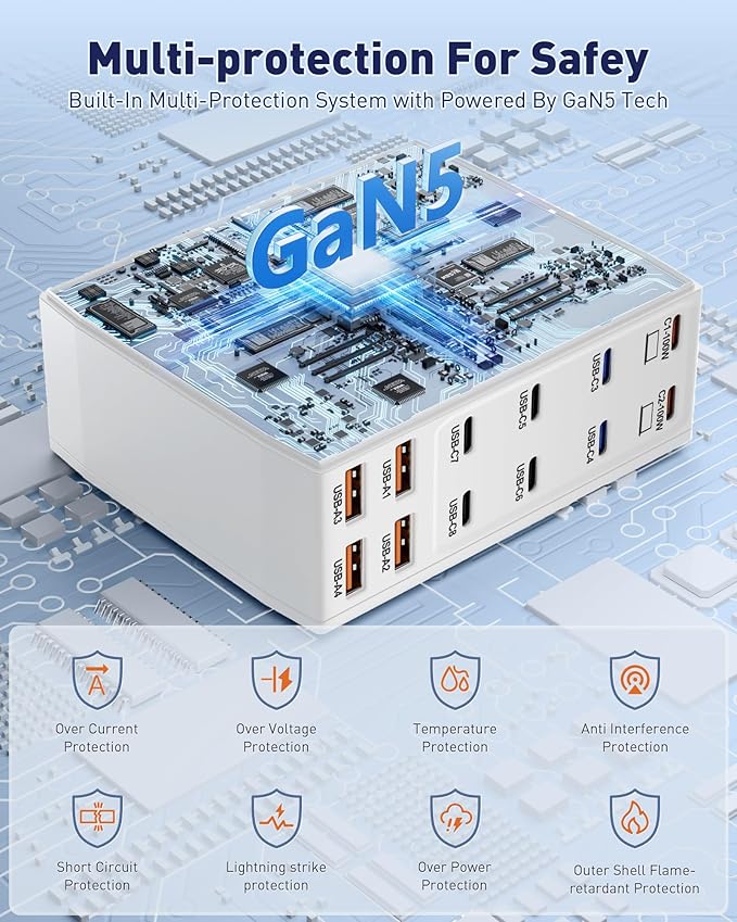- 【12-in-1 USB C Charging Station】This 600W USB C Charger Block comes with 8 USB C ports and 4 USB A ports to charge multiple devices, simplify your charging setup, and let you experience the convenience of ultra-fast and ultra-high output charging. With its smart charging technology, it can automatically detect and provide the best power output for each connected device, ensuring fast and efficient charging.
