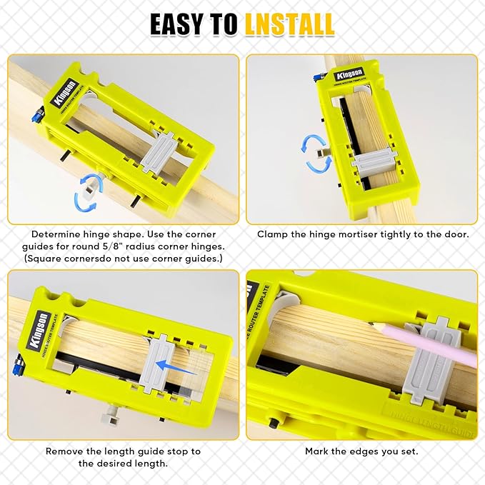 - 【Intergrated Door Hinge Mortiser.】 Thanks to two removable plastic inserts, our door hinge installation kit is a fantastic accessory to have on hand for cutting and installing door hinges of round or sqaure corner hinges. This jig allows you to cut professional looking mortises in the doors of hinge from 3” to 5“ length and Hinge Types of Sqaure, Radius 1/4” or Radius 5/8”. (Template Size: 7.8” L×3.5”W×2”H.)