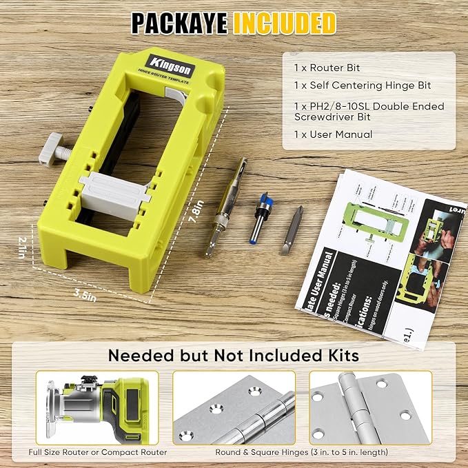 - 【Package Included.】1 Door Hinge Mortiser, 1 User Manual and 3 Included Bits – 1x Router Bit, 1x Self Centering Hinge Bit, 1x PH2/8-10SL Double Ended Screwdriver Bit. Makes perfect cuts and mounting hinges a breeze. Lots better than chiseling them out.