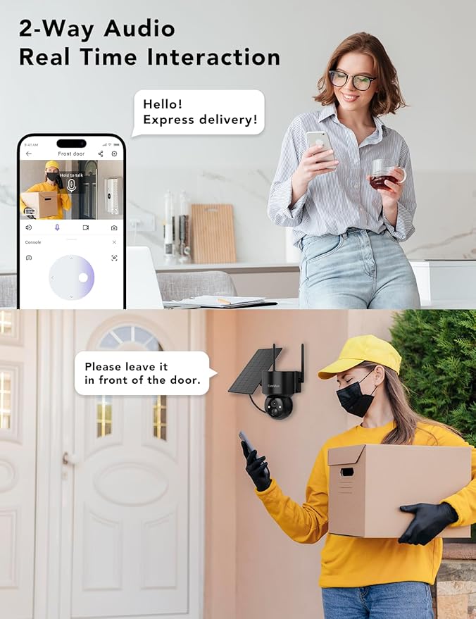 - 【PIR Motion Detection & 2-Way Talk】Equipped with PIR sensors, this wireless outdoor camera delivers precise human detection to reduce false alarms. Upon motion detection, it triggers instant alerts, records video/audio, activates alarms, and deploys a spotlight to deter intruders. Users can also engage in real-time two-way audio via mobile for direct interaction. With cloud-based alerts and sensitive motion tracking, stay in full control—whether monitoring remotely or deterring threats.
