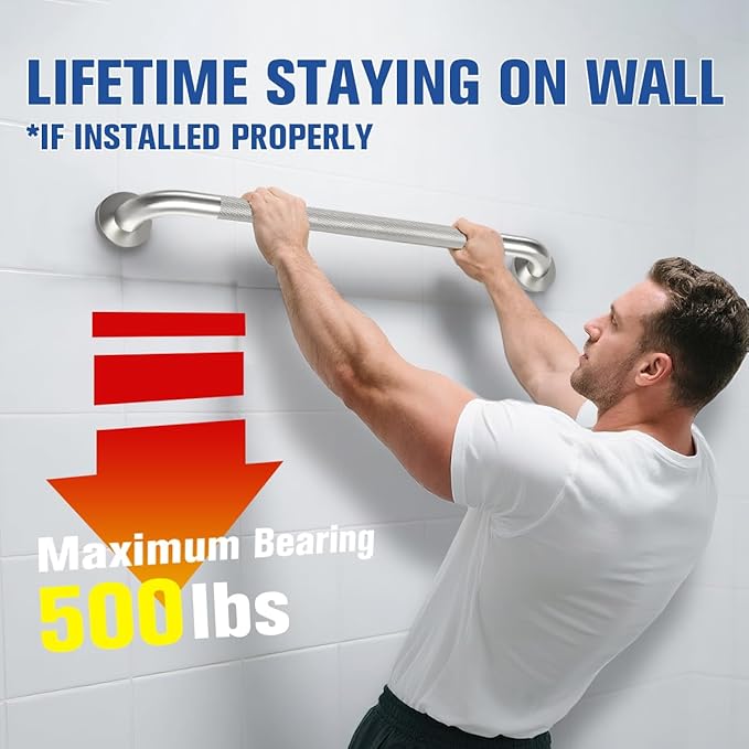 - SUPPORTIVE DESIGN: Longer and bigger screws, enlarged base and thickened tube, this bathroom shower grab bar for senior is easy to grip, supports up to 500 lbs, keeps you and your loved ones safe and secure