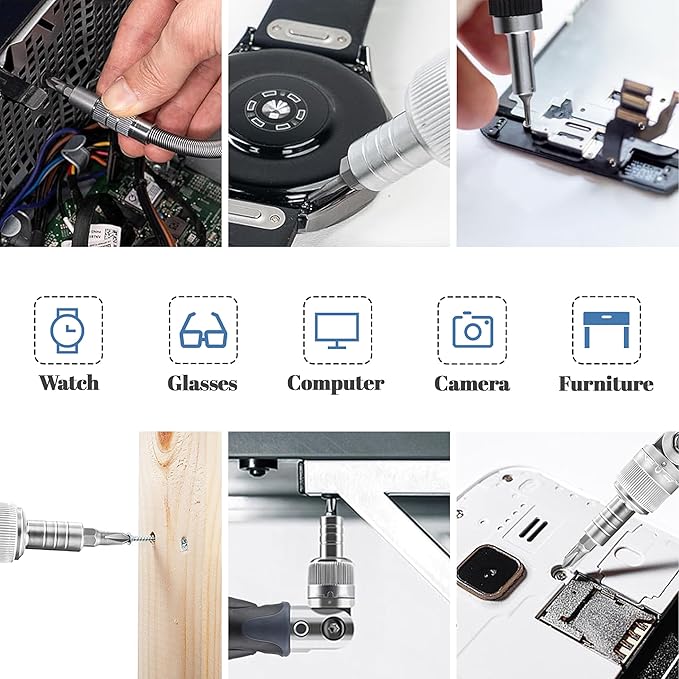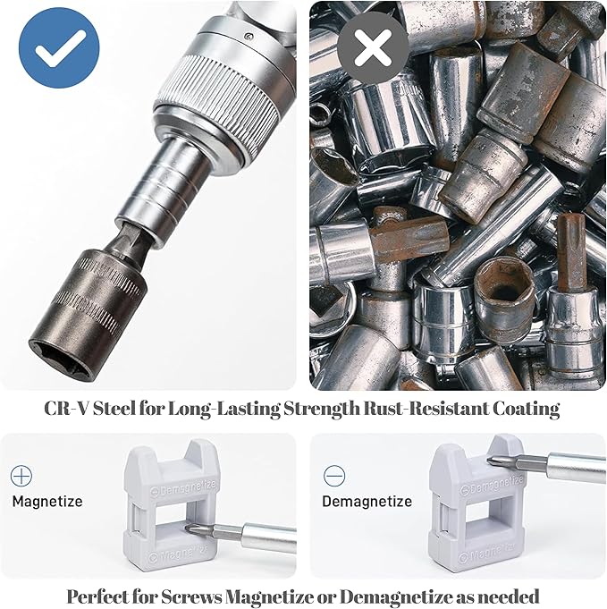 - 【Unique Design】:Dual material TPR+PP coated handle, anti slip, oil resistant, comfortable grip. All screwdriver bits are magnetized to securely hold screws in place and prevent drops. Comes with a magnetizer/demagnetizer tool to adjust magnet strength on demand — ideal for working on small electronics and precision components.