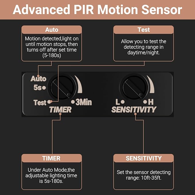 - 【Adjustable Motion Sensor】The sensor's sensitivity and timer panel are easy to adjust, providing a 5-180s timer and a maximum 26-foot reach, accommodating various temperature, height, and usage requirements without the need to disassemble the fixture.