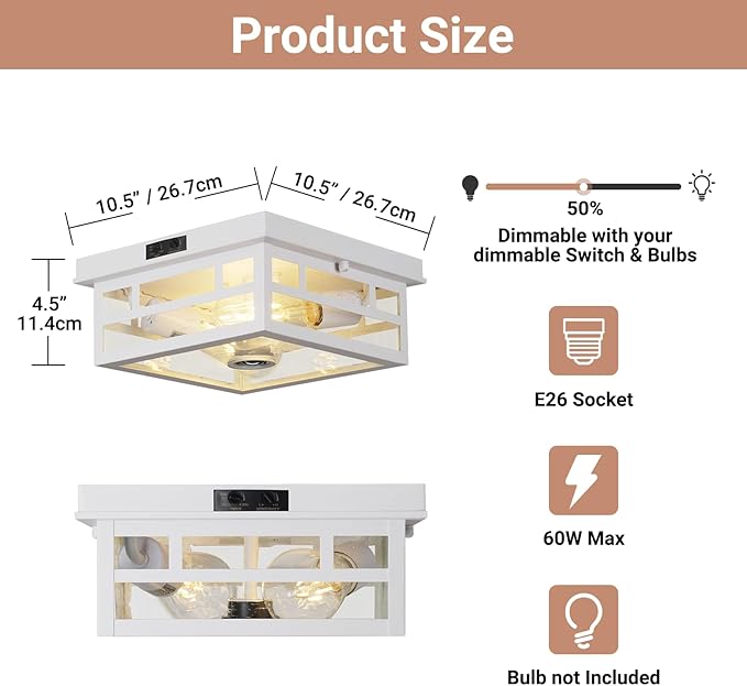 - 【2 x E26 Sockets】Measuring 10.5 inches in width and 4.5 inches in height, this motion sensor ceiling light is equipped with two E26 sockets (bulbs not included). We recommend using LED bulbs with a maximum power of 40W for energy-efficient and bright illumination.