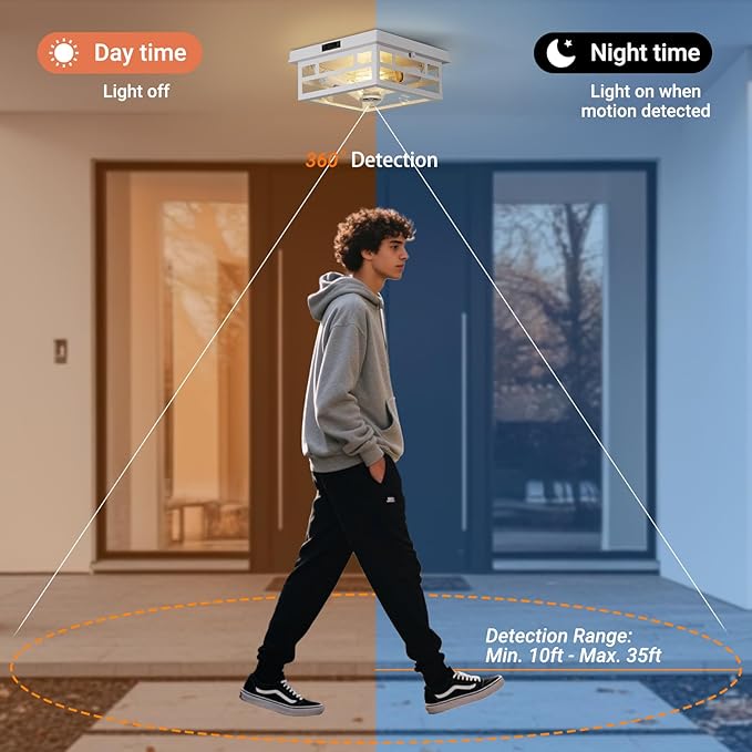 - 【Timeless Design】This outdoor motion sensor ceiling light combines durability, functionality, and modern white design, making it the ideal choice for your outdoor lighting needs. Its classic industrial-style design is complemented by a robust die-cast aluminum frame, ensuring long-lasting use both indoors and outdoors. The clear bubble glass lampshade provides a bright and appealing look, creating a comfortable lighting atmosphere in your space.