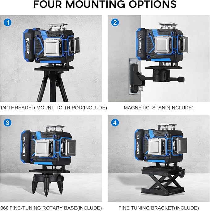 - 💡 【Four Mounting Options】 – This laser level comes with a 15–40 inch tripod (with a built-in bubble level for quick leveling), a wall mount, a 360° rotating base, and a lift base. These versatile mounting choices provide maximum flexibility and convenience for any job site, ensuring an easier and more efficient workflow. An indispensable tool for professionals and DIYers in construction, carpentry, or home improvement projects.